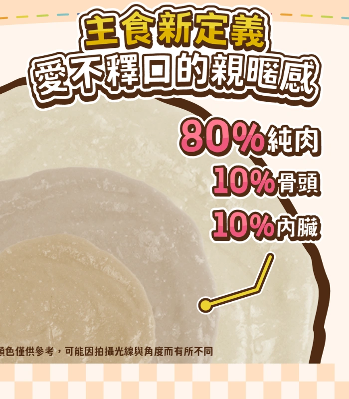 - ✅ 80%純肉 + 10%骨頭 + 10%內臟,黃金營養比例,全面滿足貓咪所需。