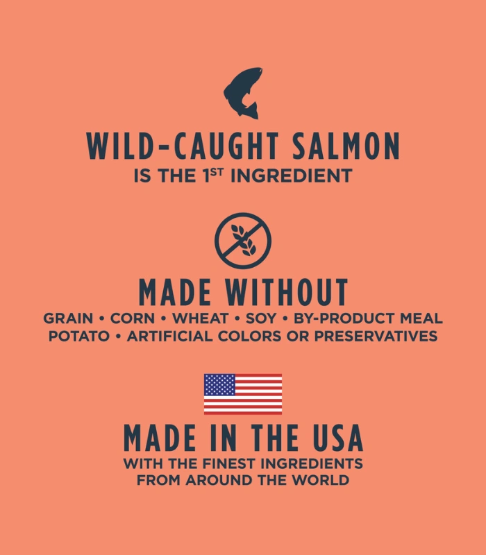 鮭魚、魚肉茸、白魚肉茸、豌豆、青花魚肉茸、菜籽油(以混合生育酚和檸檬酸保鮮)、木薯粉、鮭魚肉茸、天然香料、冷凍乾牛肉、脫水紫花苜蓿粉、鹽、冷凍乾牛肝、南瓜種子、冷凍乾牛心、蒙脫土、冷凍乾牛腎、冷凍乾牛脾、胡蘿蔔、蘋果、蔓越莓、維他命(L-抗壞血酸-2-聚磷酸鹽、維他命E補充劑、維他命K3鈉亞硫酸鹽複合物、維他命B3補充劑、維他命A補充劑、硫胺素單硝酸鹽、d-鈣泛酸鹽、核黃素補充劑、鹽酸吡哆醇、維他命B12補充劑、葉酸、維他命D3補充劑、生物素)、礦物質(蛋白質鋅、蛋白質鐵、蛋白質銅、蛋白質錳、亞硒酸鈉、乙二胺二氫碘化物)、膽鹼氯化物、牛磺酸、冷凍乾鱈魚、乾海藻、鮭魚油、藍莓、乾酵母菌發酵產品、迷迭香萃取物